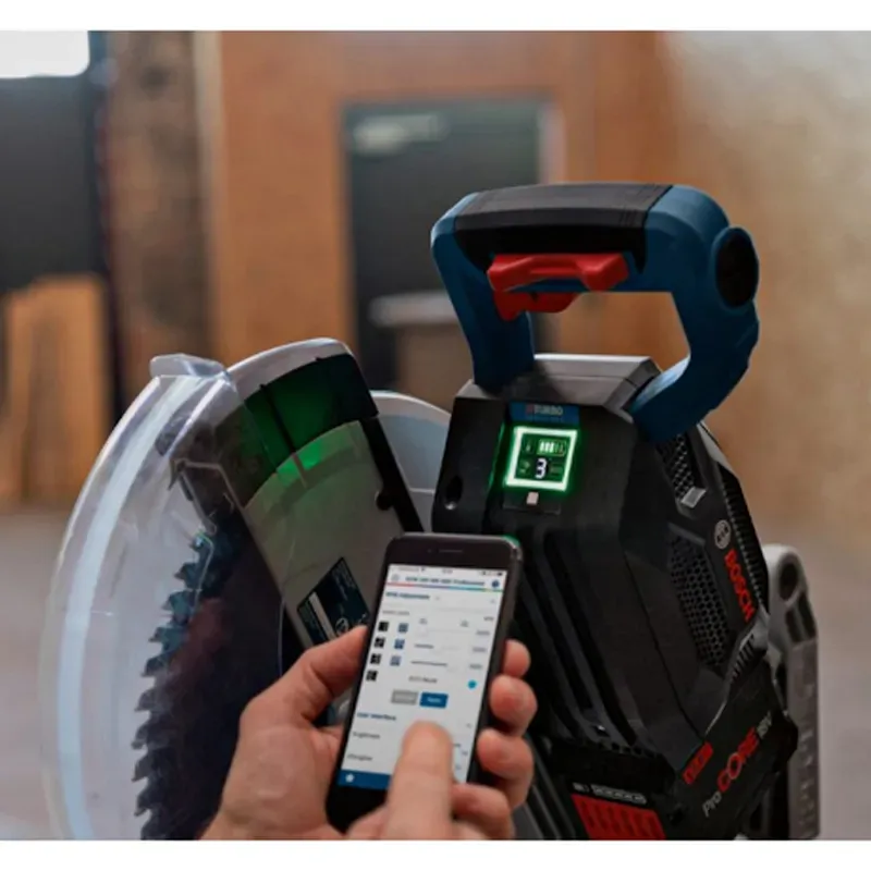 Дисплей с Bluetooth-соединением показывает остаточный уровень заряда аккумулятора и температуру мотора, электроники, батареи. Экран достаточно ярко выделяется светодиодной рамкой, которая меняет цвет в зависимости от этих показателей. Bluetooth-модуль торцевой пилы позволяет через смартфон контролировать состояние инструмента, вводить персональные настройки. Для этого нужно просто скачать на ваш гаджет приложение Bosch Toolbox и подсоединиться через него к модулю пилы.