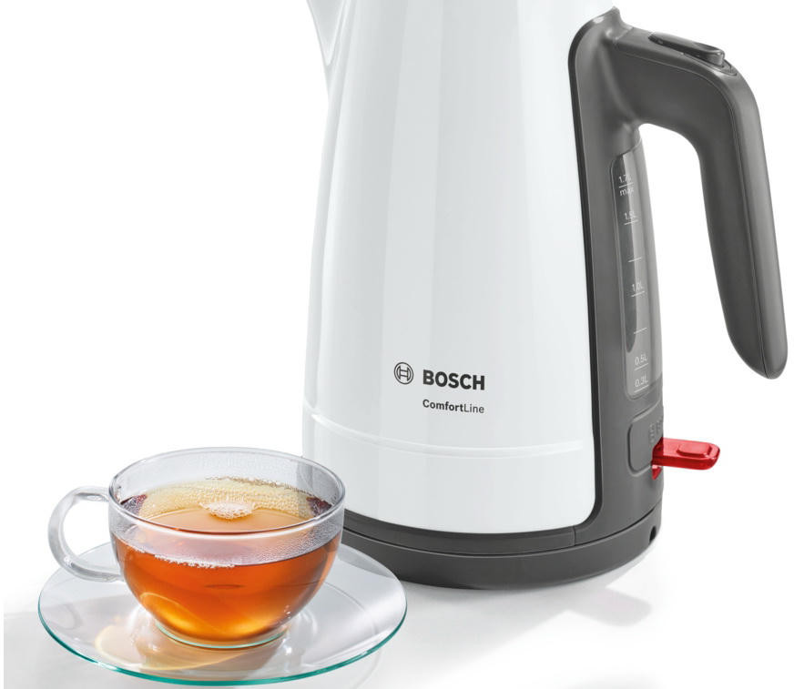 Чайник Bosch TWK 6A011 автоматически прекращает работу при отсутствии воды и при перегреве, гарантируя безопасное использование. Крышка открывается нажатием на кнопку, поэтому наполнить чайник водой можно, держа его в одной руке.