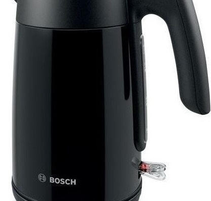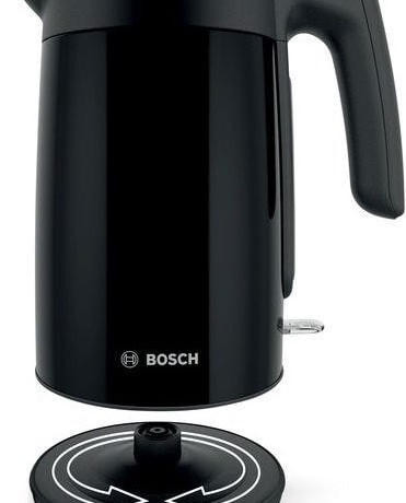Электрический чайник Bosch TWK7L463 выполнен в чёрном цвете. Автоматическое открывание крышки и отключение прибора без воды обеспечивают безопасность эксплуатации. Угол поворота подставки составляет 360 градусов, что повышает комфорт использования.