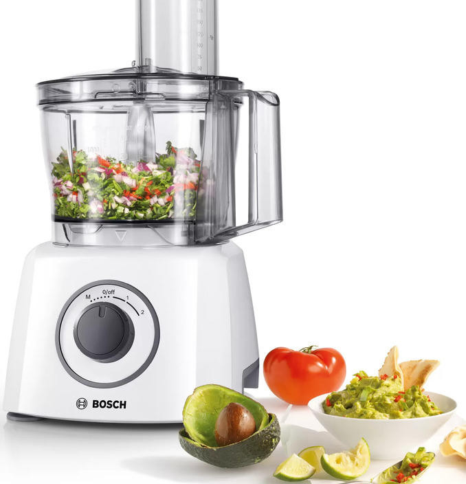 Кухонный комбайн Bosch MCM3100WGB имеет чашу в 2.3 литра в нее с легкостью помещаются аксессуары. Благодаря прорезиненным ножкам прибор устойчиво стоит при работе. Более 20 функций работы устройства с помощью насадок в комплекте таких, как двусторонний диск для нарезки и натирания.