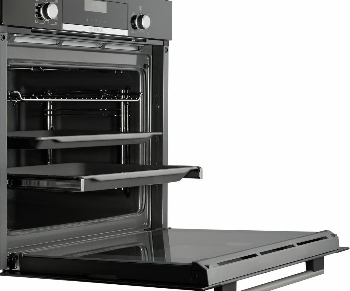Уникальное пористое покрытие EcoClean непрерывно расщепляет жир на углекислый газ и воду при каждом использовании духовки. Телескопические системы выдвижения противней обеспечивают удобный и безопасный доступ к блюдам. Одинаково безупречный результат достигается на всех трех уровнях благодаря равномерному распределению жара на режиме «3D горячий воздух».