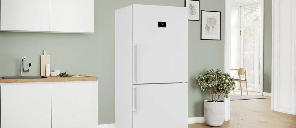 Двухкамерный холодильник Bosch KGP86FWC0N выполнен в строгом белом цвете и демонстрирует продуманную эргономику в сочетании с лаконичным внешним видом. Вертикальная накладная ручка подчёркивает монументальность корпуса, дверной упор расположен справа, при этом предусмотрена возможность перенавешивания полотна для удобства расстановки в кухонном пространстве. Внутреннее устройство разделено на два основных отсека: холодильный и морозильный, причём холодный блок занимает верхнюю часть, а морозильный расположен внизу, что упрощает доступ к часто используемым продуктам. Общий полезный объём достигает внушительных 624 литров — 422 литра выделено под охлаждение и 202 литра отведено для заморозки. Для сохранения качества продуктов использованы современные технологические подходы: динамическая система распределения воздуха MultiAirflow обеспечивает равномерное распределение температуры по полкам, а функция суперохлаждения позволяет быстро понизить температуру свежих закладок, минимизируя влияние на уже охлаждённые продукты.