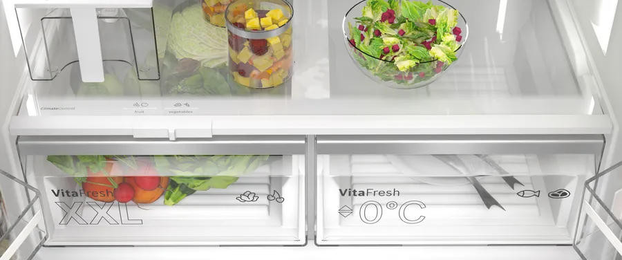 Внутреннее пространство организовано с прицелом на рациональное хранение большого ассортимента продуктов: общая полезная вместимость составляет 574 л, из которых холодильная камера даёт 375 л, а морозильная — 199 л. Внутреннее светодиодное освещение равномерно освещает полки из высокопрочного стекла, среди которых пять расположены в холодильной секции, четыре регулируемые по высоте и одна фиксированная для устойчивых тяжёлых предметов. На дверце размещены пять полочных модулей, включая полку для бутылок и ёмкость для яиц, что помогает распределить нагрузку и сохранить порядок. Зона свежести VitaFresh 0°С предоставляет оптимальные условия для овощей, фруктов и скоропортящихся продуктов, позволяя дольше сохранять текстуру и вкус без использования дополнительных упаковочных материалов.