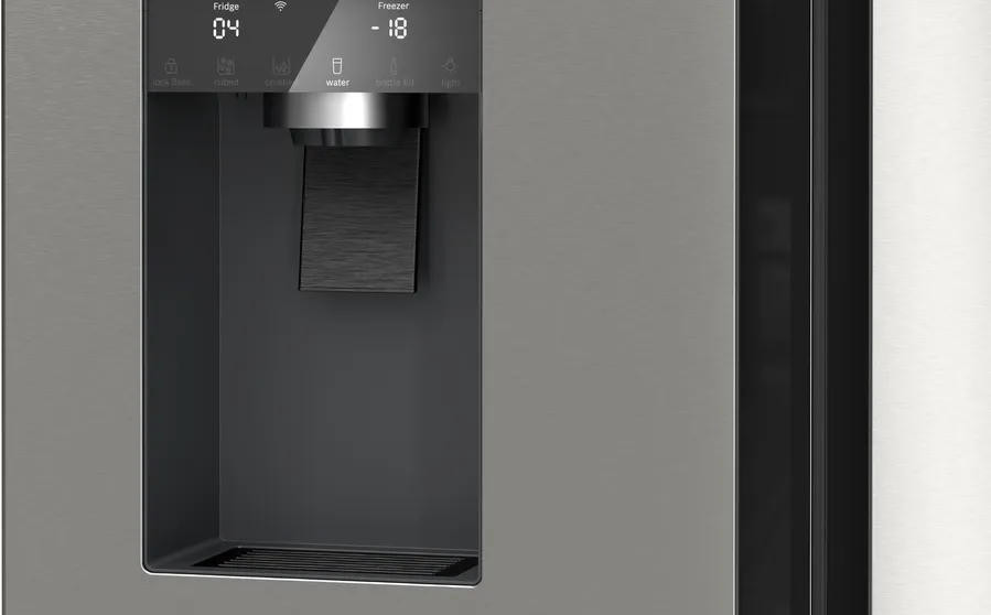 Холодильник Side-by-Side Bosch KFI96APEA элегантный и внушительный по габаритам прибор сочетает современный индустриальный стиль с тщательной продуманностью эргономики, идеально вписываясь в интерьер просторной кухни. Корпус выполнен в благородном цвете нержавеющей стали, где вертикальная встроенная ручка подчёркивает минимализм фасада, а плоские шарниры обеспечивают аккуратное прилегание полотен при установке. Визуальная лаконичность не мешает функциональности: фронтальная панель оснащена электронным сенсорным управлением и информативным дисплеем, который выводит основные параметры и режимы, а также указывает на состояние работы компрессора и контура охлаждения. Уровень шума всего 39 дБ делает эксплуатацию максимально комфортной даже в открытой планировке, а длина сетевого кабеля 2,4 м упрощает подключение без применения удлинителей.