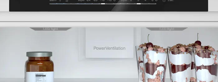 Внутреннее освещение холодильной камеры выполнено на светодиодах, что обеспечивает яркое и равномерное освещение. В морозильной камере предусмотрено три ящика, а также ванночка для льда. Система охлаждения NoFrost предотвращает образование инея, а автоматическая система размораживания облегчает уход за холодильником.