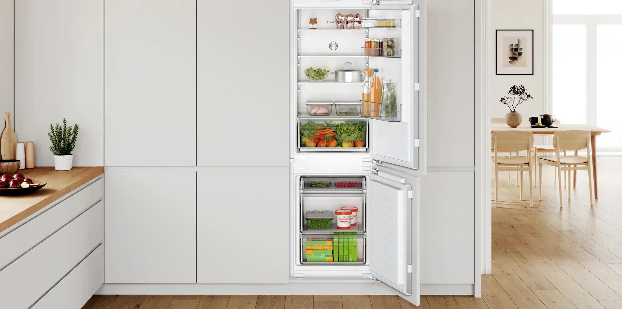 Встраиваемый холодильник Bosch KIV 86 NFF0 оснащен системой EcoAirflow — оптимальная циркуляция воздуха и постоянная температура охлаждения. Ящик Big Box: идеально подходит для размещения морозильных ящиков или крупных замороженных товаров. Светодиодное освещение потребляет меньше энергии, чем обычное освещение холодильника и прослужит в течение всего жизненного цикла устройства.