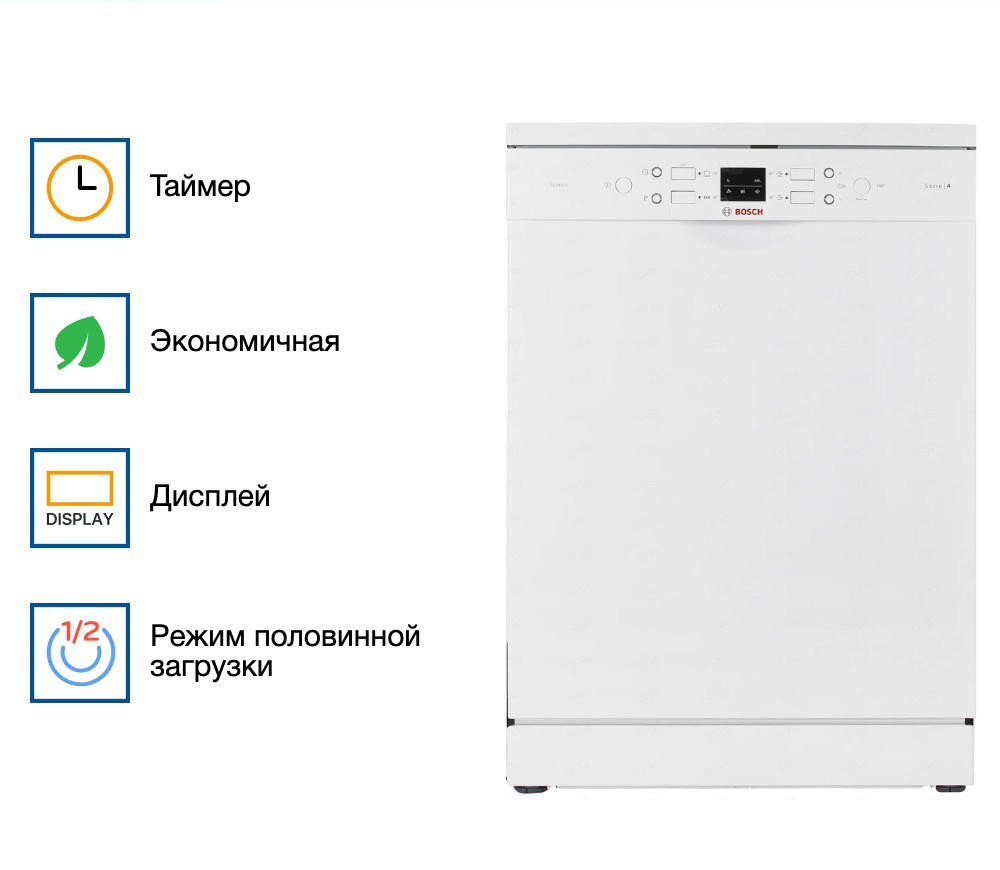 Посудомоечная машина Bosch SMS44DW01T характеризуется экономичным потреблением электричества и воды. За счет этого можно снизить затраты на оплату коммунальных услуг. Устройство осуществляет эффективное удаление жира, пригоревшей пищи и других сложных загрязнений с тарелок, столовых приборов, кастрюль и кружек. При необходимости включение модели можно перенести на удобное для пользователя время. Это обеспечивается посредством функции «Отсрочка запуска». Благодаря сушке конденсационного типа посуду не требуется протирать полотенцем после очищения. Выбор необходимых функций или установка температурного режима осуществляется посредством электронной панели управления. Устройство создает незначительный уровень шума в процессе работы, что обеспечивает дополнительное удобство при повседневной эксплуатации. Высоту положения корзины можно изменить благодаря специальной системе крепления. Это позволяет убирать в камеру даже крупные кастрюли, сковородки и другую посуду.