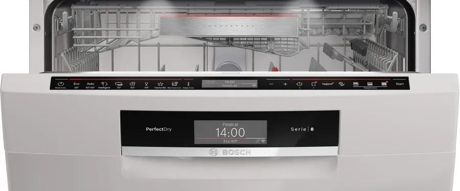 Панель управления открытая, с сенсорными кнопками и дисплеем. Также есть возможность удаленного запуска через приложение на смартфоне благодаря функции Home Connect. Индикаторы наличия ополаскивателя, соли и времени до окончания программы помогают контролировать процесс мытья. Таймер отсрочки запуска позволяет запланировать начало работы машины в удобное для вас время. Машина имеет три корзины, в том числе переставляемую по высоте верхнюю корзину с системой Rackmatic-3 и корзину для столовых приборов в нижнем коробе. Система AquaStop и полная защита от протечек обеспечивают безопасность использования. Блокировка от детей предотвращает случайное включение или изменение программы.