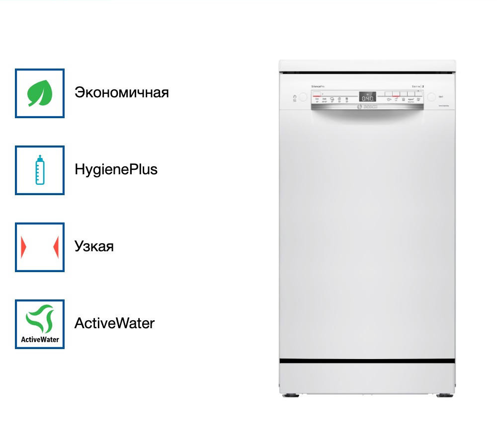 Модель относится к узким и отдельностоящим, что делает ее идеальным выбором для небольших кухонь или для тех, кто хочет экономить пространство. При этом, несмотря на свои компактные размеры, машина способна вместить до 10 комплектов посуды, что позволяет справиться даже с большим количеством грязной посуды после праздничного ужина. Особенностью данной модели является использование теплообменника для сушки посуды. Этот метод сушки более мягкий и экологичный, поскольку он использует остаточное тепло от последнего цикла мойки. Это не только экономит энергию, но и предотвращает появление на посуде разводов и пятен.