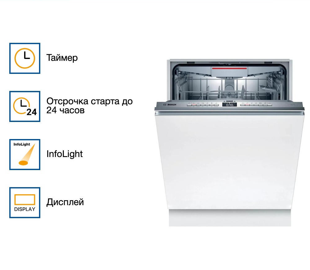 Встраиваемая посудомоечная машина Bosch SMV 4 HVX33E оснащен тихим мотором EcoSilence Drive. Благодаря стандартным размерам и современному дизайну отлично впишется в любой кухонный интерьер. За один цикл машина отмывает 13 комплектов посуды. Устройство оснащено индикаторами наличия соли и ополаскивателя. Датчик AquaSensor следит за чистотой воды после ополаскивания. Если она недостаточно чистая, то система её сливает и наполняет камеру новой.