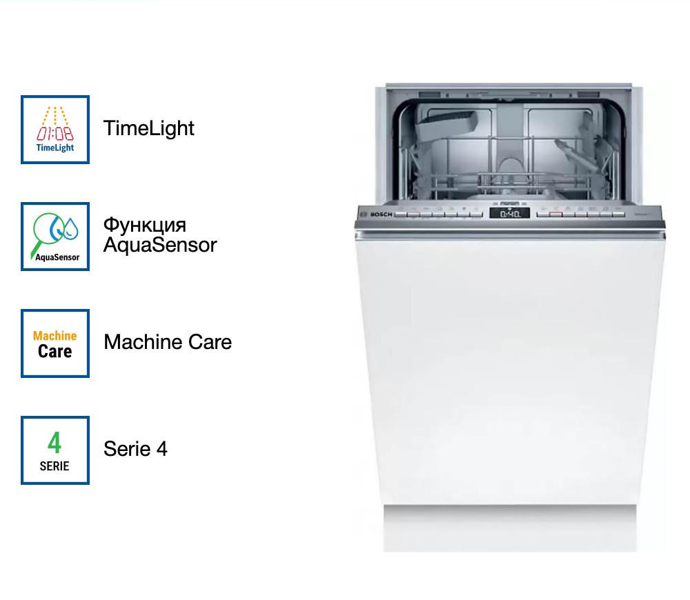 Посудомоечная машина Bosch SPV 4 EKX29E оборудована индикатором TimeLight он отображается на полу во время работы устройства и показывает время до окончании программы. Устройство способно загрузить 9 комплектов посуды. 6 программ мойки помогут разобраться с любыми загрязнениями.