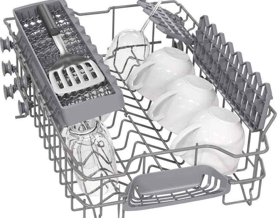 Встраиваемая посудомоечная машина Bosch SPV2IKX01Q создана для компактных кухонь и аккуратно интегрируется в мебельный ряд, занимая минимальную площадь без ущерба практичности. Черная панель управления стильно контрастирует с фронтальной поверхностью, а закрытая панель сохраняет лаконичный внешний вид при закрытой дверце и упрощает меблировку. Двухкорзинная компоновка с верхним отсеком, оборудованным двумя полочками для чашек, и нижней корзиной с ячейками и складными направляющими для тарелок обеспечивает гибкость при расстановке посуды, а корзина для столовых приборов упрощает загрузку приборов и ускоряет подготовку к мойке.