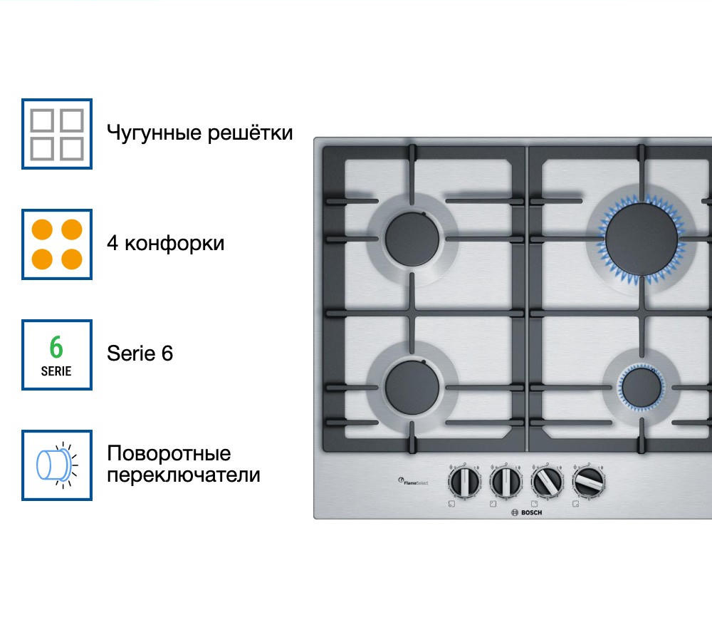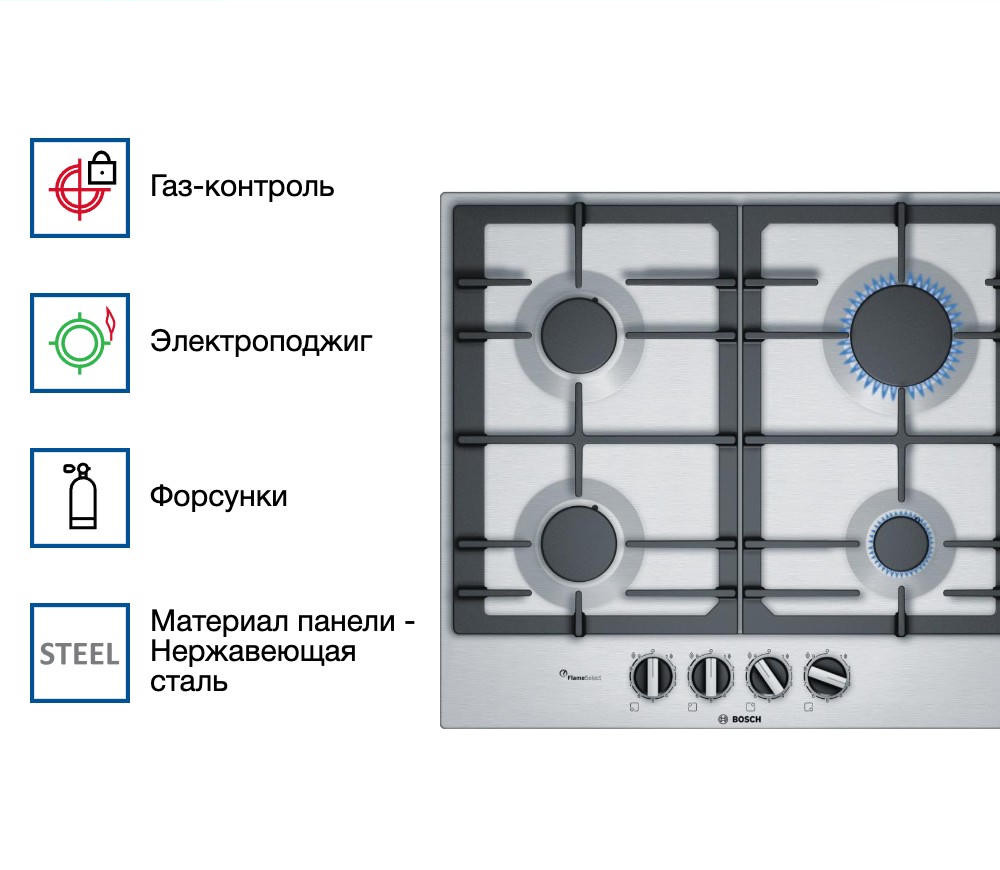 Безопасную эксплуатацию газовой варочной панели Бош PСP6А5B90R осуществляет система газ-контроль, которая подразумевает, что благодаря специальным датчику и клапану при случайном угасании огня газ мгновенно блокируется и перестает поступать — утечка предотвращена. Также важно заметить, что оборудование обладает удобными габаритами для встраивания, и оно не займет много места на вашей кухни: высота — 4,5 см, ширина — 58,2 см, глубина — 52 см.