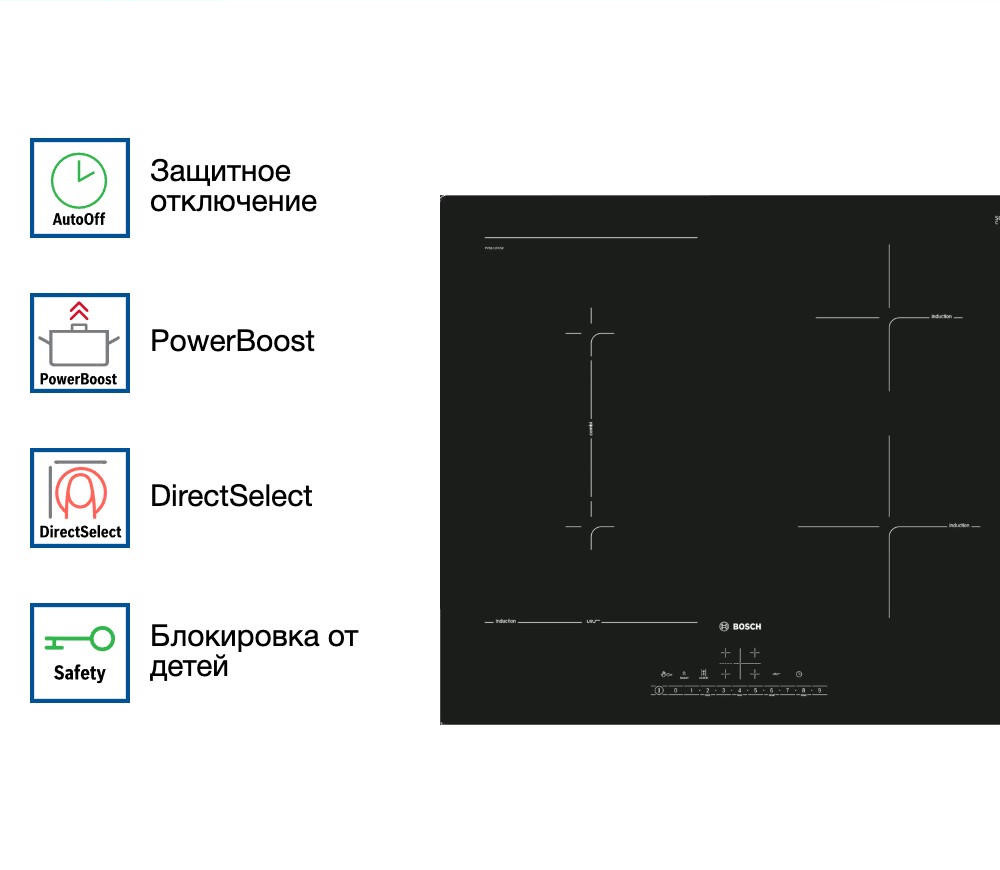 Варочная панель Bosch PVS611FC5Z оснащена функцией ReStart при непроизвольном выключении устройства, настройки восстановятся при следующем запуске. CombiZone позволяет объединить две конфорки в одну и вы можете готовить в посуде нестандартных размеров. PerfectFry отслеживает уровень нагрева и предотвращает пригорание блюда.