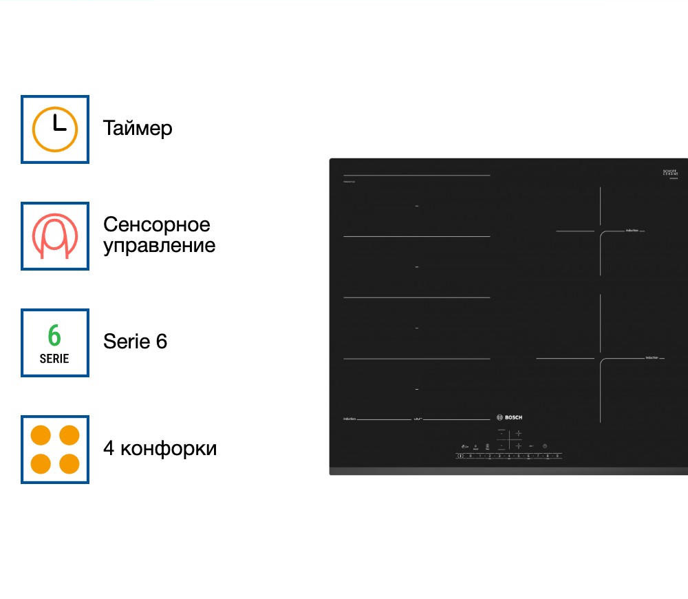 Варочная панель Bosch PXE631FC1E — экономичная современная модель для вашей кухни. Экономия достигается за счет индукции, когда нагревается сама посуда, а не плита. Готовить на ней получается быстрее, чем на электрической. Преимущества такой техники еще и в том, что даже случайно «сбежавшая» пища не пригорает к ней, ее легко отмыть. И значительно снижается риск ожогов. О том, что конфорка остыла, вас предупредит погасшая индикация остаточного тепла. Регулировать температуру приготовления вы сможете чувствительными сенсорными кнопками. Необходимые показатели можно выставить очень точно — у прибора 17 ступеней мощности. Все настройки видно на TFT дисплее.