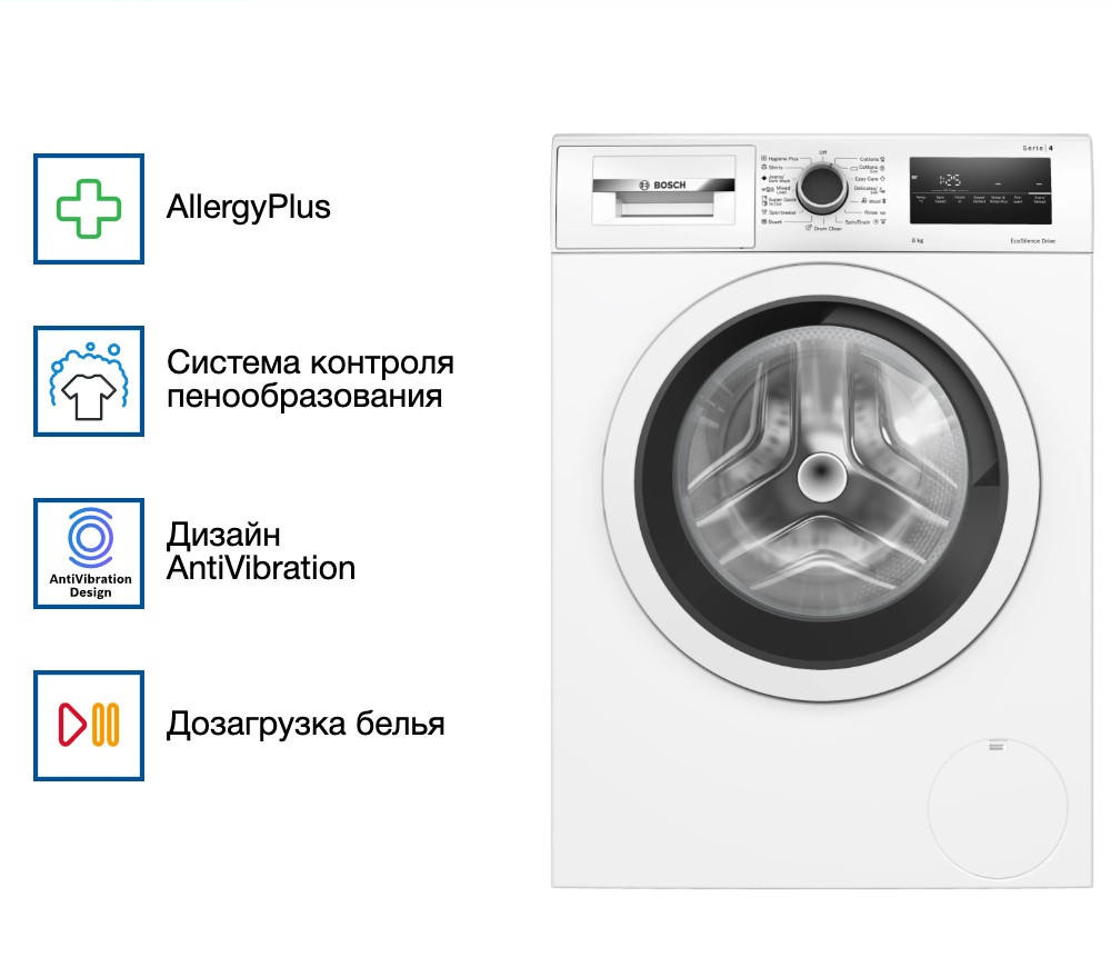 Барабан рассчитан на загрузку до 8 кг, что оптимально для семьи из 3-4 человек. Фронтальная загрузка обеспечивает удобство при закладке и извлечении вещей. За бесшумную и плавную работу отвечает инверторный мотор EcoSilenceDrive — он не только снижает уровень шума, но и увеличивает срок службы техники. Управление осуществляется через интуитивно понятную электронную панель с поворотным селектором и сенсорными элементами. Информативный LED-дисплей отображает текущий этап цикла, оставшееся время, рекомендованную загрузку и данные о работе системы SmartEcoControl, отвечающей за энергоэффективность.