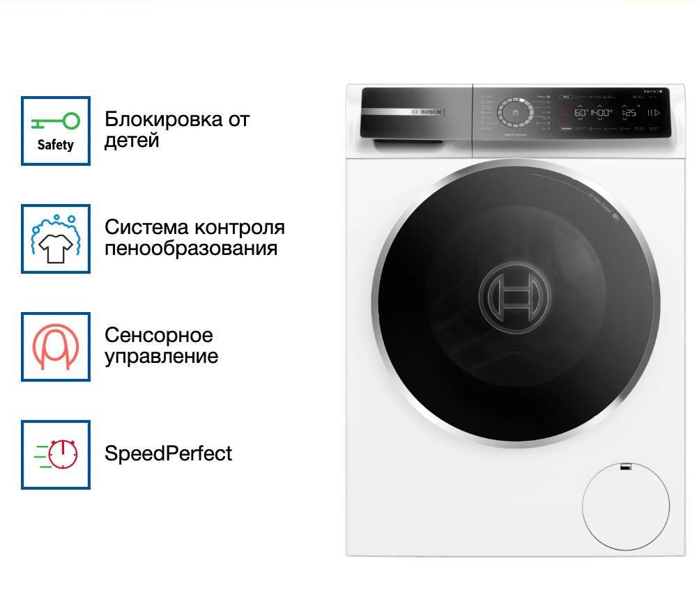 Скорость отжима достигает 1400 оборотов в минуту, обеспечивая эффективное удаление влаги из белья. Управление стиральной машиной осуществляется с помощью сенсорных элементов и многофункционального LED-дисплея. На дисплее отображается информация о ходе программы, времени до окончания стирки и максимальной загрузке для выбранной программы. Также предусмотрена функция отложенного старта, позволяющая настроить время начала стирки на удобное для вас время. Bosch WGB24400ME оснащена 14 программами стирки, включая предварительную стирку, стирку хлопка, синтетики, смешанного белья и деликатных тканей.