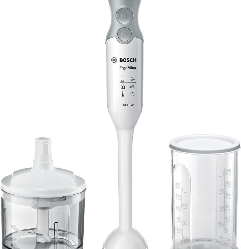Блендер Bosch MSM 14500 — это погружная модель из серии ErgoMixx. Она представлена в сочетании белого и серого цветов, что позволяет ей вписаться в кухонный интерьер различных видов. Термостойкий пластик, из которого изготовлены корпус, погружная часть и чаша измельчителя, позволяет готовить горячие блюда — например, супы. Устройство оснащено ножом с четырьмя лезвиями QuattroBlade, которые способны качественно измельчить твердые продукты до состояния однородной массы.