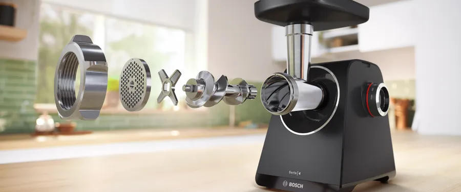 Мясорубка Bosch MFWS450B выполнена из прочного пластика, что делает прибор стильным и практичным элементом кухонного пространства. Небольшие размеры (24.7 х 20 х 24 см) и вес 4.9 кг облегчают размещение на рабочей поверхности и хранение, а прорезиненные ножки обеспечивают устойчивость при интенсивной эксплуатации. Модель из серии MultiPower Series 4 сочетает аккуратный внешний вид с функциональной компоновкой: загрузочный лоток пластиковый, удобной конфигурации, позволяет быстро подавать куски продукта к механизму, а универсальный толкатель повышает безопасность и эффективность работы. В корпус встроены отсеки для хранения насадок и для сетевого шнура, что сохраняет порядок и сокращает время подготовки к использованию.