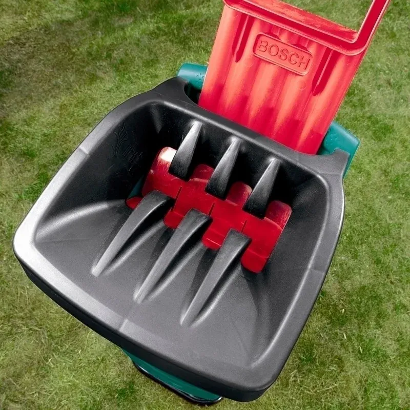 Режущий механизм закрыт специальным экраном, который исключает контакт с вращающимися лезвиями.Корпус садового измельчителя Bosch установлен на пластиковые колесики для удобства перемещения по горизонтальной поверхности. Подставка и металлическая рама гарантирую защиту от механических повреждений.