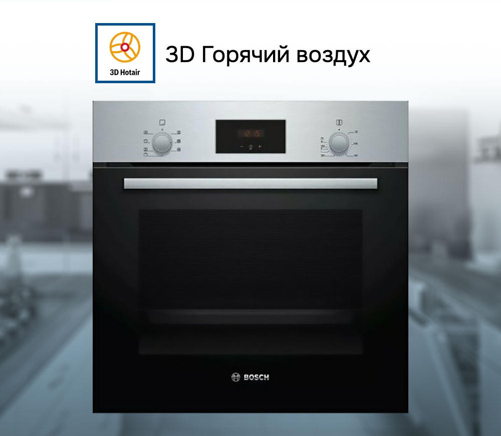 Духовой шкаф Bosch HBF133BR0 — это электрическая независимая модель. Она выполнена в цвете «нержавеющая сталь», благодаря чему отлично вписывается в современный кухонный интерьер. Ее внутренний объем составляет 66 литров, благодаря чему есть возможность запекать большие блюда. Управление осуществляется посредством нажатия кнопок, поворота переключателей, а также использования сенсорных кнопок. Благодаря многофункциональным часам Easy Clock можно с легкостью отслеживать время до окончания работы одной из программ. LED-дисплей имеет высокое качество изображения и устойчив к высоким температурам. Откидная дверца с двухслойным стеклом надежно удерживает пар внутри. Имеются телескопические направляющие, благодаря которым противень легко выдвигается, а риск получения ожога снижен..