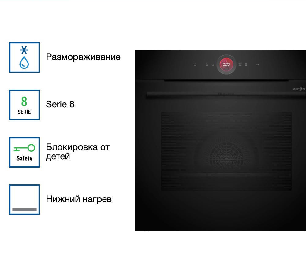 Духовой шкаф Bosch HBG9742B1S из премиальной линейки Serie | 8 — это образец современной кухонной техники, где продуманная эргономика встречается с передовыми технологиями. Его строгий чёрный корпус придаёт кухне утончённый и минималистичный вид, идеально вписываясь в интерьеры любого стиля. Независимая конструкция и стандартные габариты (59,5 x 59,4 x 56,7 см) обеспечивают лёгкую встройку в любую кухонную мебель без сложных адаптаций.