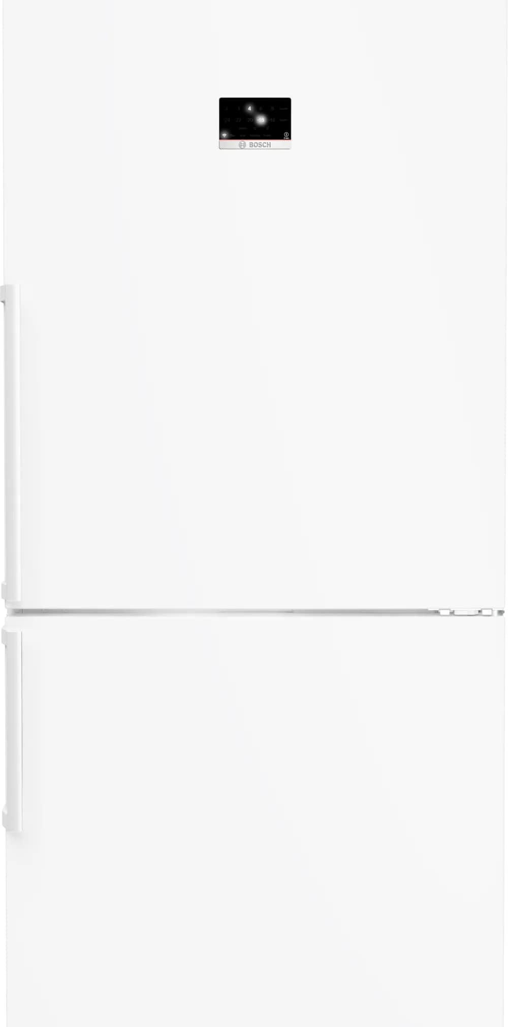 Двухкамерный холодильник Bosch KGP86FWC0N выполнен в строгом белом цвете и демонстрирует продуманную эргономику в сочетании с лаконичным внешним видом. Вертикальная накладная ручка подчёркивает монументальность корпуса, дверной упор расположен справа, при этом предусмотрена возможность перенавешивания полотна для удобства расстановки в кухонном пространстве. Внутреннее устройство разделено на два основных отсека: холодильный и морозильный, причём холодный блок занимает верхнюю часть, а морозильный расположен внизу, что упрощает доступ к часто используемым продуктам. Общий полезный объём достигает внушительных 624 литров — 422 литра выделено под охлаждение и 202 литра отведено для заморозки. Для сохранения качества продуктов использованы современные технологические подходы: динамическая система распределения воздуха MultiAirflow обеспечивает равномерное распределение температуры по полкам, а функция суперохлаждения позволяет быстро понизить температуру свежих закладок, минимизируя влияние на уже охлаждённые продукты.