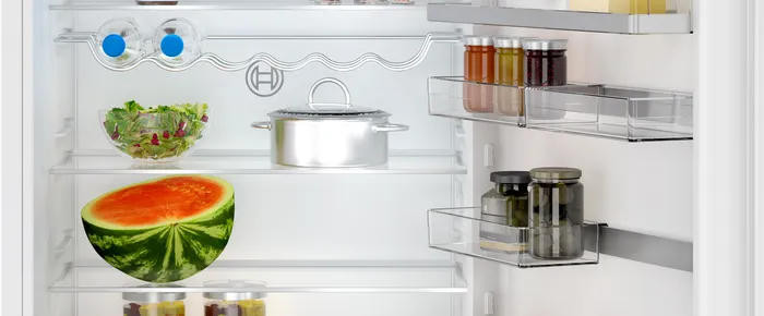 Внутреннее освещение холодильной камеры выполнено на светодиодах, что обеспечивает яркое и равномерное освещение. В морозильной камере предусмотрено три ящика, а также ванночка для льда. Система охлаждения NoFrost предотвращает образование инея, а автоматическая система размораживания облегчает уход за холодильником.
