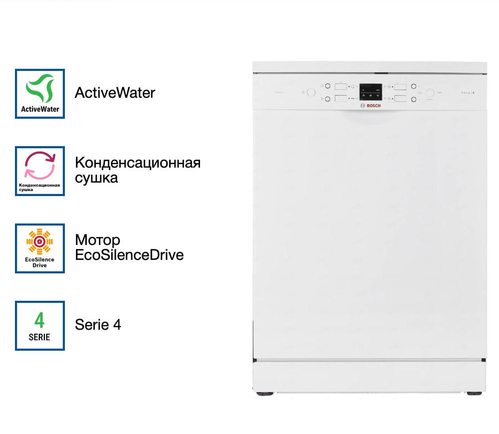 Посудомоечная машина Bosch SMS44DW01T характеризуется экономичным потреблением электричества и воды. За счет этого можно снизить затраты на оплату коммунальных услуг. Устройство осуществляет эффективное удаление жира, пригоревшей пищи и других сложных загрязнений с тарелок, столовых приборов, кастрюль и кружек. При необходимости включение модели можно перенести на удобное для пользователя время. Это обеспечивается посредством функции «Отсрочка запуска». Благодаря сушке конденсационного типа посуду не требуется протирать полотенцем после очищения. Выбор необходимых функций или установка температурного режима осуществляется посредством электронной панели управления. Устройство создает незначительный уровень шума в процессе работы, что обеспечивает дополнительное удобство при повседневной эксплуатации. Высоту положения корзины можно изменить благодаря специальной системе крепления. Это позволяет убирать в камеру даже крупные кастрюли, сковородки и другую посуду.