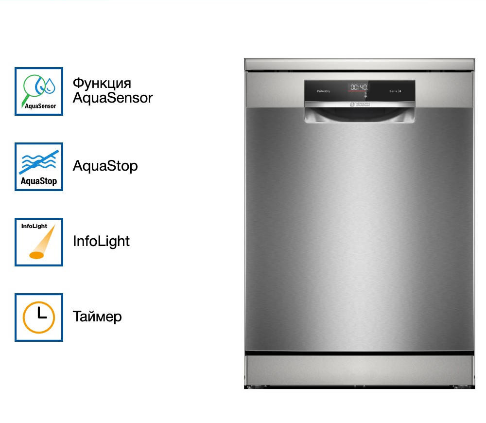 Машина оснащена открытой панелью управления с дисплеем и кнопками. С помощью приложения Home Connect вы можете управлять машиной дистанционно с вашего смартфона. Индикаторы наличия ополаскивателя и соли помогают контролировать их уровень. Также на полу проецируется индикатор InfoLight, который сигнализирует о том, что машина работает. Модель оснащена тремя корзинами, верхняя из которых регулируется по высоте. Верхний короб имеет шесть складных направляющих для тарелок и одну полочку для чашек, а нижний - восемь направляющих FLIPTINES для глубокой посуды и две полки для чашек. Это позволяет гибко организовать пространство внутри машины. Модель оборудована системой AquaStop, которая обеспечивает полную защиту от протечек. Внутренний резервуар выполнен из нержавеющей стали, что гарантирует его долговечность. Максимальная потребляемая мощность составляет 2400 Вт, а уровень шума - всего 43 дБ, что делает эту модель одной из самых тихих на рынке. Посудомоечная машина Bosch SMS8YCI03E - это надежный и функциональный помощник на вашей кухне, который обеспечит идеальную чистоту и блеск вашей посуды.