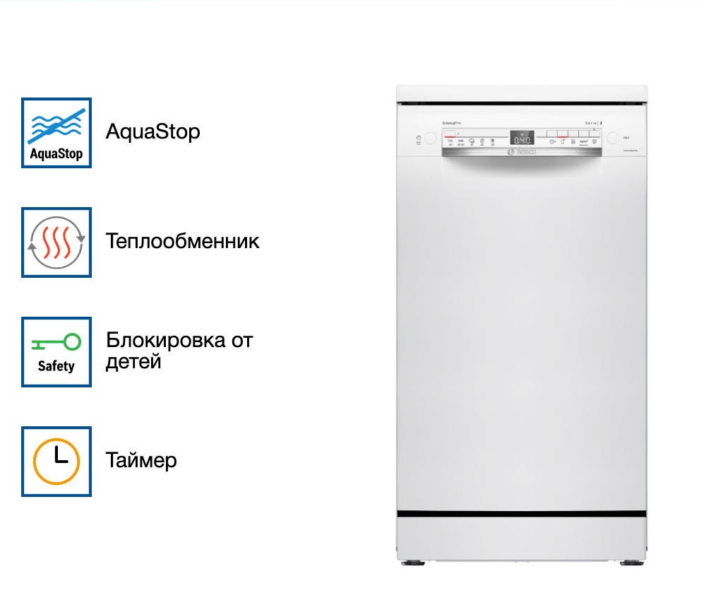Модель относится к узким и отдельностоящим, что делает ее идеальным выбором для небольших кухонь или для тех, кто хочет экономить пространство. При этом, несмотря на свои компактные размеры, машина способна вместить до 10 комплектов посуды, что позволяет справиться даже с большим количеством грязной посуды после праздничного ужина. Особенностью данной модели является использование теплообменника для сушки посуды. Этот метод сушки более мягкий и экологичный, поскольку он использует остаточное тепло от последнего цикла мойки. Это не только экономит энергию, но и предотвращает появление на посуде разводов и пятен.