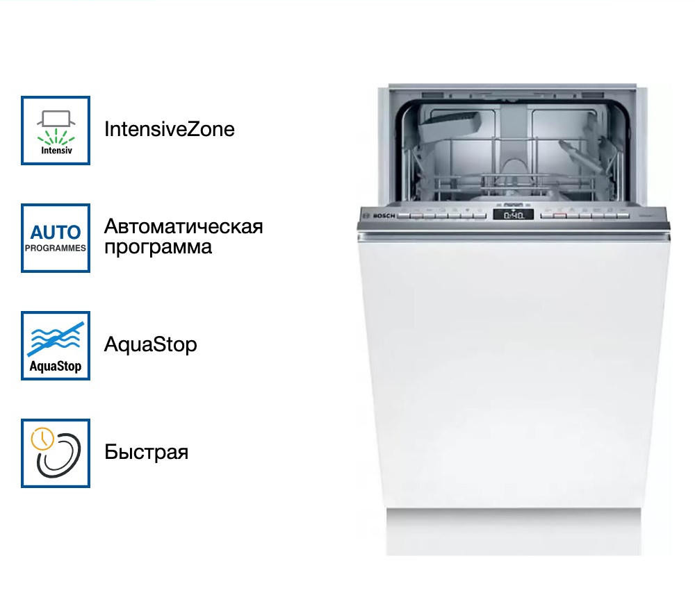 Посудомоечная машина Bosch SPV 4 EKX29E оборудована индикатором TimeLight он отображается на полу во время работы устройства и показывает время до окончании программы. Устройство способно загрузить 9 комплектов посуды. 6 программ мойки помогут разобраться с любыми загрязнениями.