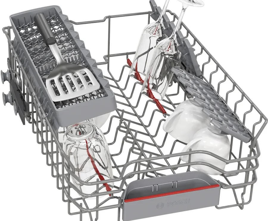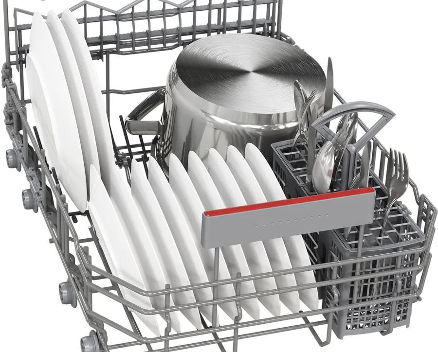 Внутреннее пространство из нержавеющей стали рассчитано на 10 комплектов, расположенных на двух уровнях: верхняя корзина с системой Rackmatic-3 позволяет менять высоту без усилий, а набор из двух полочек для чашек в верхнем ярусе и дополнительной полки для чашек в нижней корзине обеспечивает аккуратное размещение хрупкой посуды; направляющие для тарелок представлены двумя складными элементами в верхнем отсеке и аналогичными в нижнем. В нижнем отсеке предусмотрена корзина для столовых приборов, что упрощает сортировку. Самоочищающийся фильтр снижает необходимость ручного обслуживания, а Machine Care предлагает программу для ухода за машиной и поддержания чистоты резервуара.