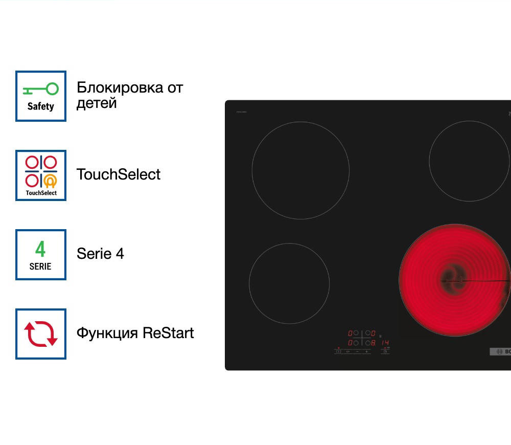 Варочная панель оснащена 17 ступенями мощности, функциями ReStart и QuickStart, а также главным выключателем. Функция защитного отключения и блокировка от детей обеспечивают безопасность использования. Индикатор остаточного тепла поможет избежать ожогов после приготовления пищи.