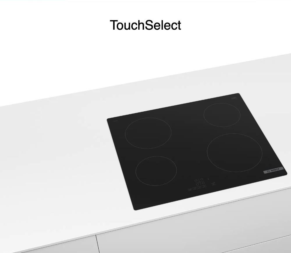 Поверхность панели выполнена из стеклокерамики черного цвета, что придает ей элегантный и современный вид. Сенсорные элементы управления и система управления TouchSelect обеспечивают удобство и простоту использования, позволяя быстро и точно настраивать режимы работы.