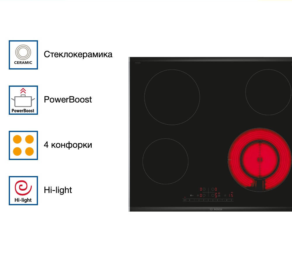Функция ReStart позволяет быстро возобновить работу панели после внезапного отключения питания, сохраняя выбранные ранее настройки. Функция PowerBoost значительно увеличивает мощность конфорки, что позволяет сократить время приготовления блюд.