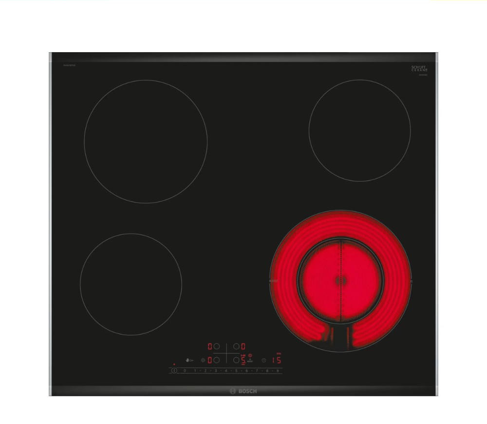 Варочная панель Bosch PKF675FP2E выполнена из стеклокерамики черного цвета, что придает ей элегантный и стильный вид. Металлический профиль по бокам придаёт дополнительную прочность и устойчивость к повреждениям.