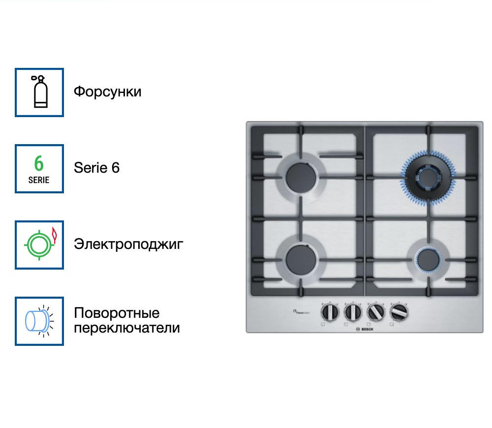 Гарантии безопасности и комфортной эксплуатации обеспечивает электроподжиг. Благодаря его наличию пламя загорается простым поворотом переключателя, без использования спичек и зажигалок. Варочная панель Бош PСH6А5B90R — залог безопасности.