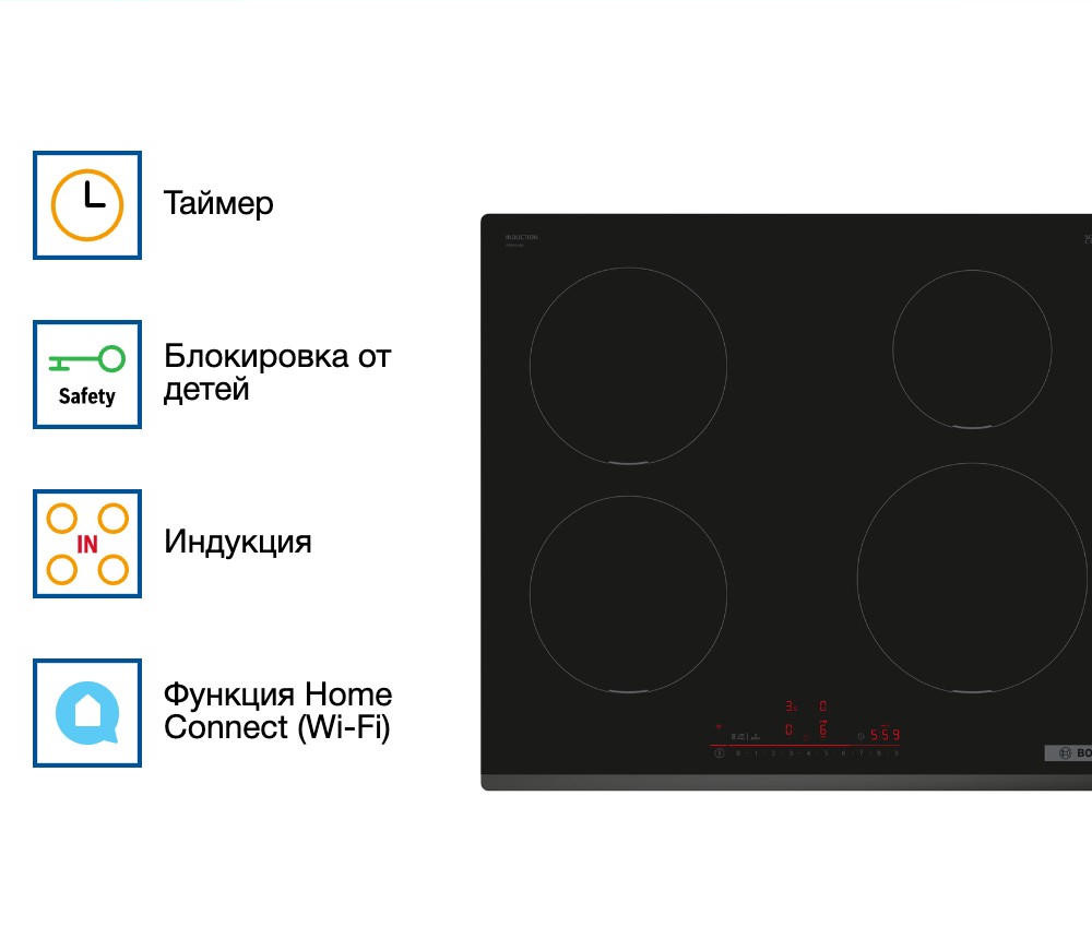 Кроме того, модель оснащена защитным отключением, блокировкой от детей и функцией Cleaning-пауза, которая обеспечивает безопасность и удобство использования. Индикатор остаточного тепла позволяет контролировать состояние панели после приготовления пищи. Функция Home Connect позволяет управлять панелью с помощью смартфона или планшета. Это удобное и современное решение для тех, кто ценит комфорт и технологичность. Гарантийный срок на панель составляет 12 месяцев, что подтверждает высокое качество и надежность модели.