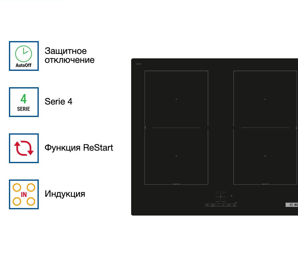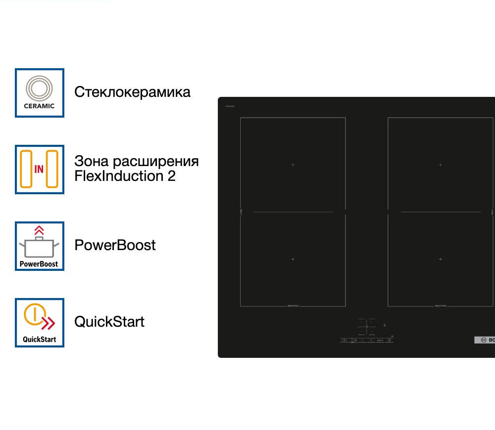 Индукционная варочная панель Bosch PVQ61RBB5E – это современное и функциональное решение для кухни. Произведенная в Евросоюзе, эта модель представляет собой сочетание высокого качества, надежности и стильного дизайна. Стеклокерамическая поверхность черного цвета с прямым краем не только выглядит элегантно, но и обеспечивает легкий уход и долгий срок службы. Панель оборудована четырьмя конфорками, каждая из которых имеет 17 ступеней мощности. Это позволяет точно настроить температуру приготовления, адаптируясь под различные блюда и рецепты. Кроме того, две зоны расширения FlexInduction обеспечивают большую гибкость в выборе посуды для приготовления.
