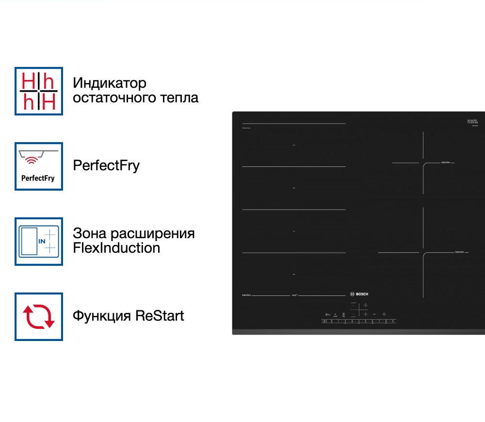 Варочная панель Bosch PXE631FC1E — экономичная современная модель для вашей кухни. Экономия достигается за счет индукции, когда нагревается сама посуда, а не плита. Готовить на ней получается быстрее, чем на электрической. Преимущества такой техники еще и в том, что даже случайно «сбежавшая» пища не пригорает к ней, ее легко отмыть. И значительно снижается риск ожогов. О том, что конфорка остыла, вас предупредит погасшая индикация остаточного тепла. Регулировать температуру приготовления вы сможете чувствительными сенсорными кнопками. Необходимые показатели можно выставить очень точно — у прибора 17 ступеней мощности. Все настройки видно на TFT дисплее.