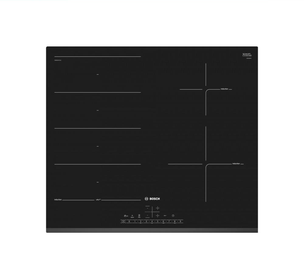 Обратите внимание, как необычно выглядят 4 конфорки. Если вы ставите посуду необычного, большого размера, не стоит беспокоиться о том, что она прогреется неравномерно. При необходимости можно увеличить площадь теплового воздействия. Кроме того, Бош PXE631FC1E позволяет пользоваться на этой поверхности сразу несколькими кастрюлями или сковородками одновременно. На короткое время, например, когда необходимо быстро вскипятить воду, можно активировать функцию PowerBoost, которая увеличит мощность плиты до 50% и уменьшит продолжительность нагрева на 20%.