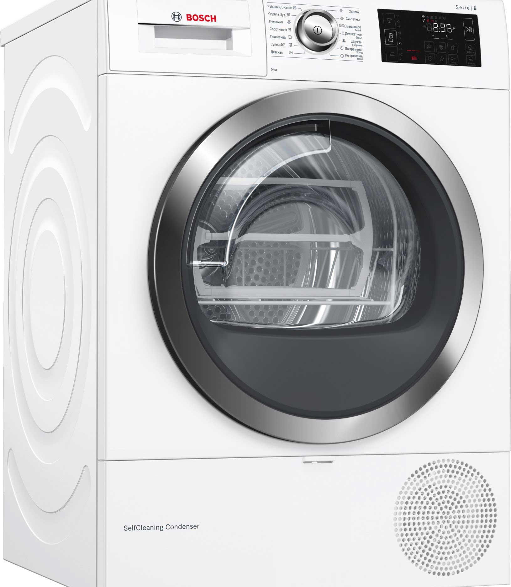 BOSCH WTW876H0OE имеет конденсационный тип сушки с применением теплового насоса, что значительно увеличивает эффективность процесса и снижает потребляемый расход энергии. Стандартный двигатель, проверенный временем, не дает сбоев. Максимальная загрузка составляет 9 кг. Класс энергоэффективности A++ позволит сократить траты на электричество. Электронное управление осуществляется по средствам поворотных переключателей и сенсорных клавиш Touch control. Большой многофункциональный LED-дисплей отображает необходимую информацию о работе. Барабан выполнен из нержавеющей стали устойчивой к воздействию влаги и высоких температур. Отвод конденсата может осуществляться напрямую в канализацию. По завершении цикла вы услышите приятный звуковой сигнал. Максимальное время отсрочки старта составляет 24 часа. В стандартный комплект входят корзина для сушки шерсти, самоочищающийся конденсатор и ворсовый фильтр. Гарантия от производителя составляет 12 месяцев.